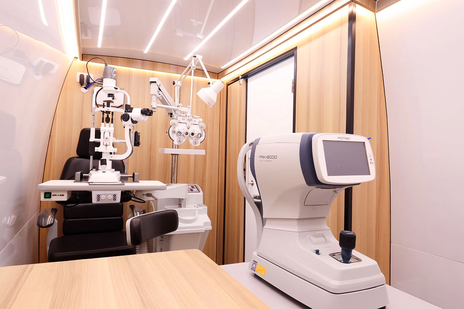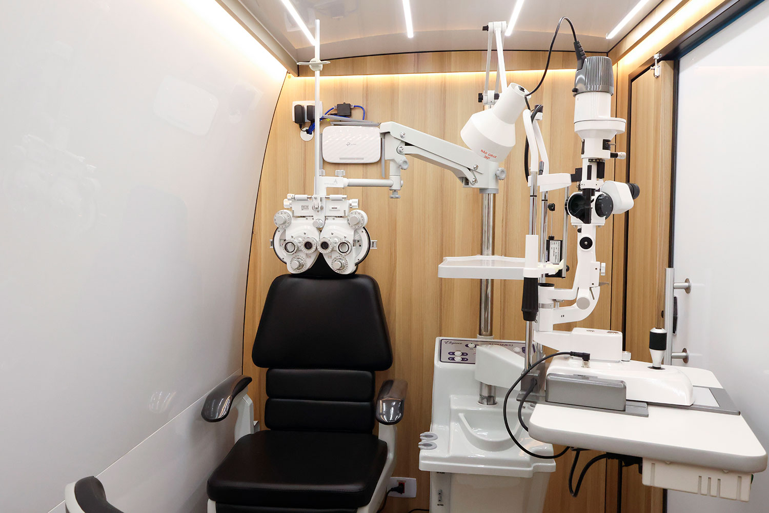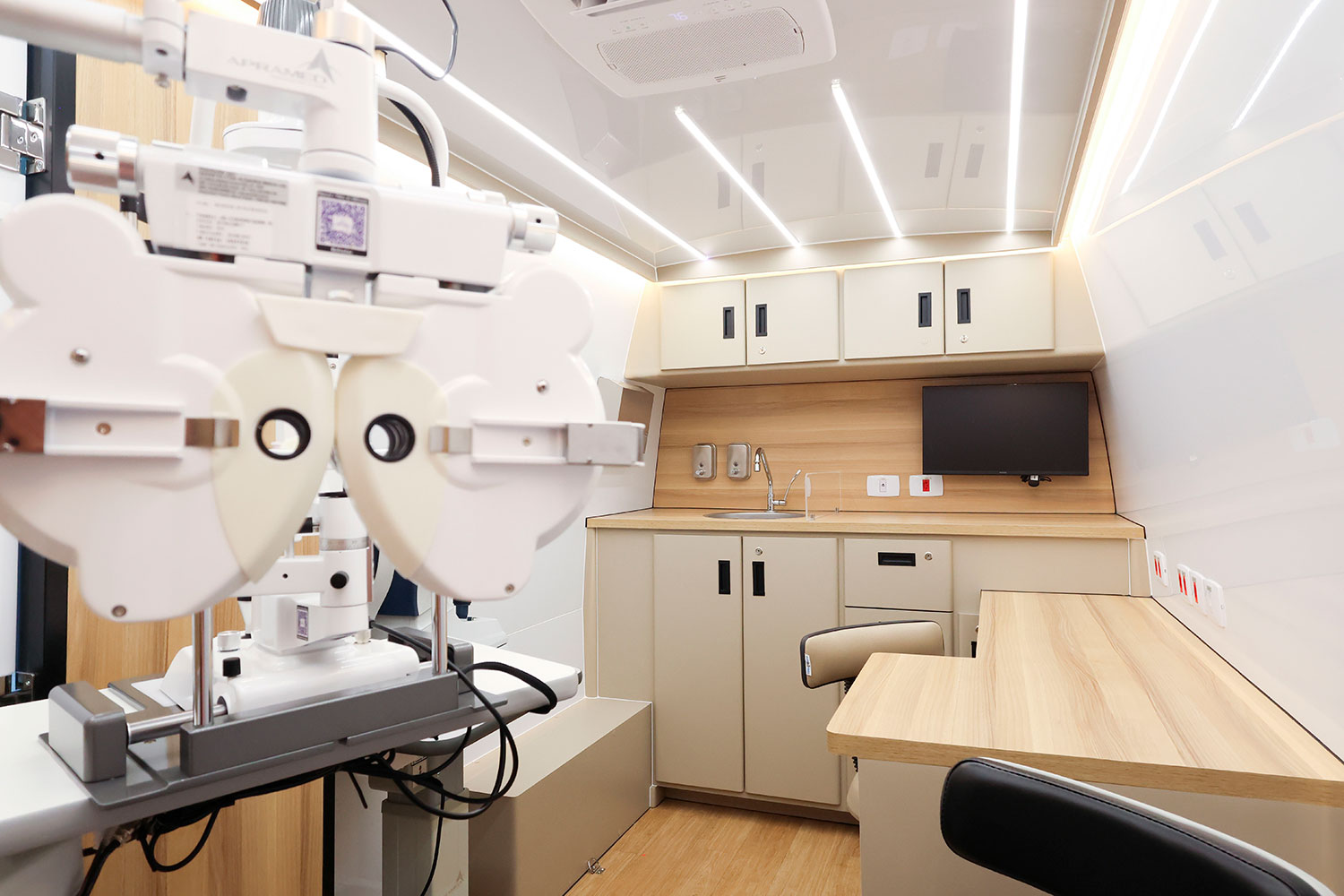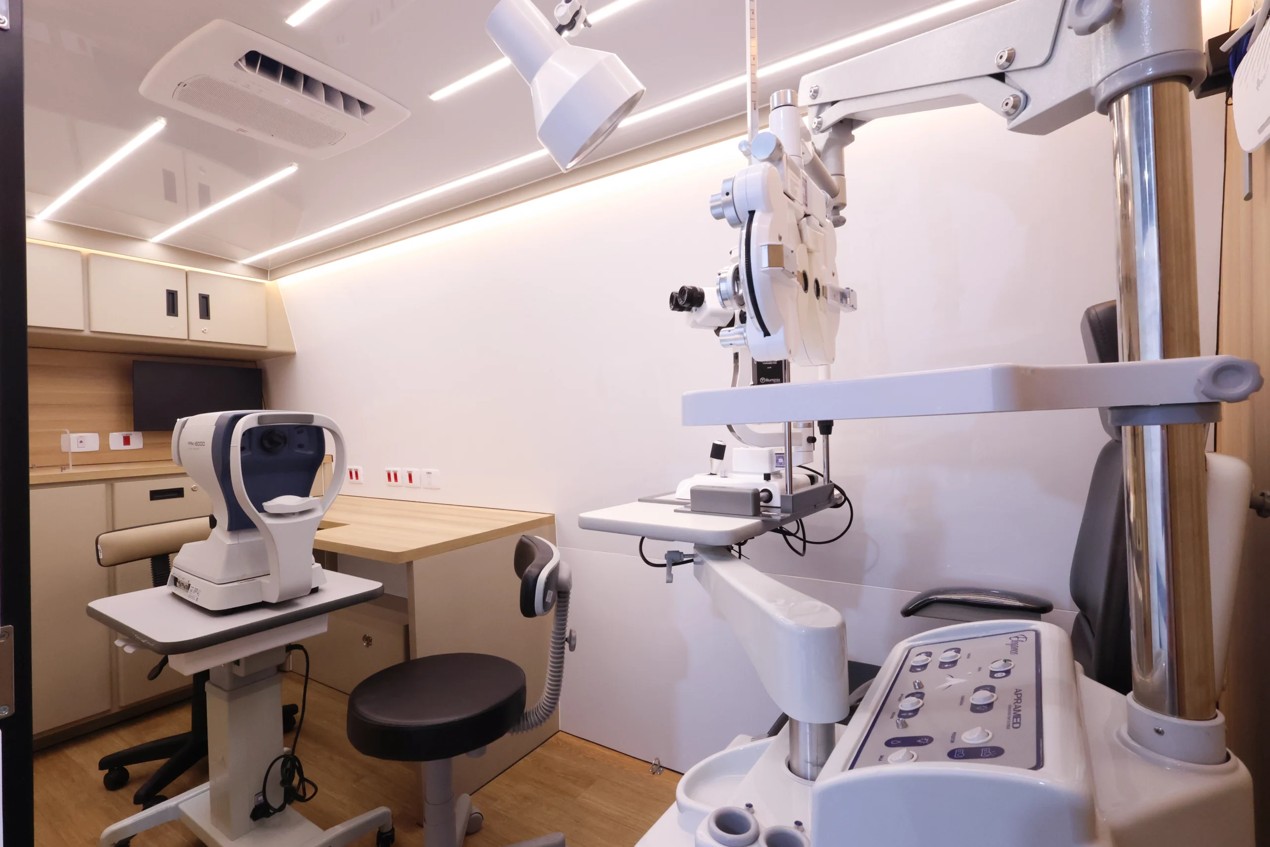 A unidade móvel oftalmológica para prefeituras pode receber equipamentos de ponta para realização de consultas e exames. Entre os recursos mencionados no projeto estão: