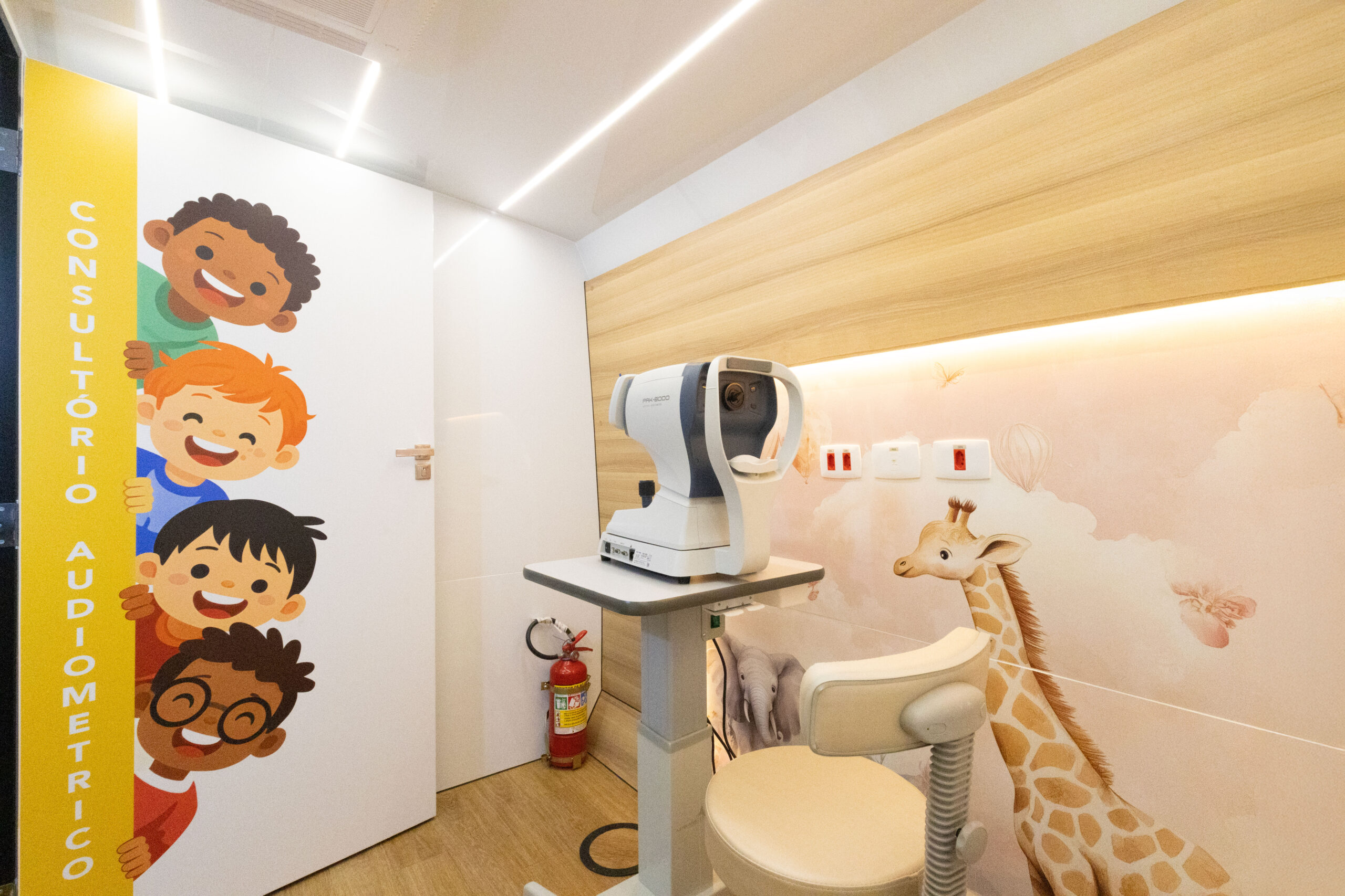No consultório oftalmológico, a unidade oferece ambiente adequado para avaliações visuais com conforto e organização. Já o espaço odontológico foi desenvolvido para garantir privacidade, fluxo eficiente e atendimento especializado sobre rodas. A área de audiometria complementa a proposta com foco em cuidado preventivo e apoio direto à saúde infantil. Essas soluções aparecem ao longo do material como parte de uma proposta integrada, pensada para atender com qualidade comparável à de uma unidade fixa.